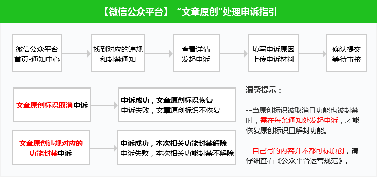 当一篇文章被平台判断为滥用原创后,其微信公众平台通知中心将会收到两条处理通知:取消原创标识、原创功能封禁,如有异议,需分别发起申诉。