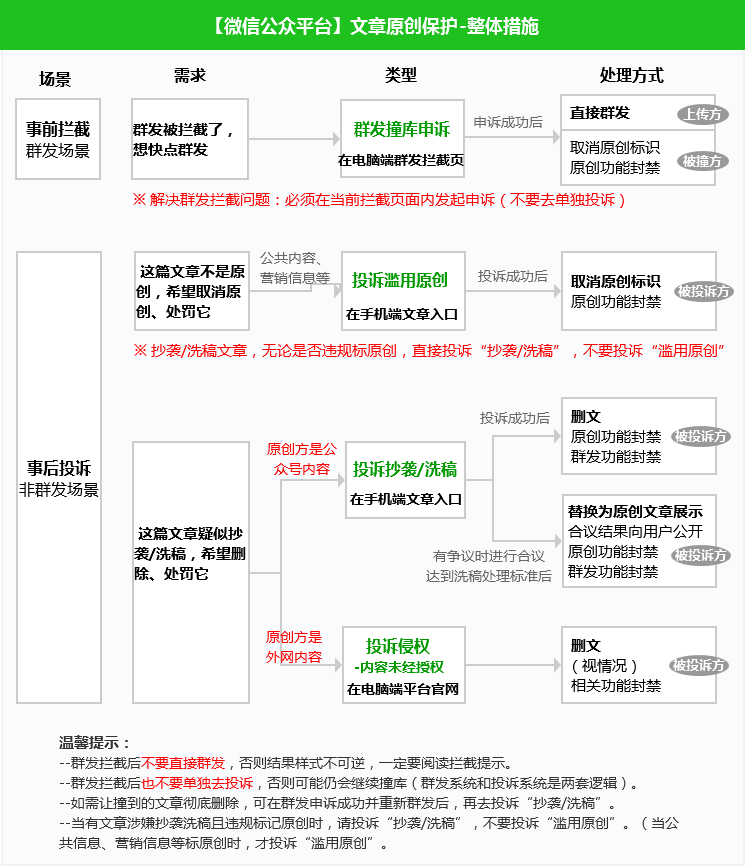 切记:如果有文章抄袭洗稿且违规标记原创,请务必投诉”抄袭/洗稿“,不要投诉“滥用原创”。因为抄袭洗稿投诉的处理会同步考虑原创的处理,且针对有争议的情况有洗稿合议流程解决。