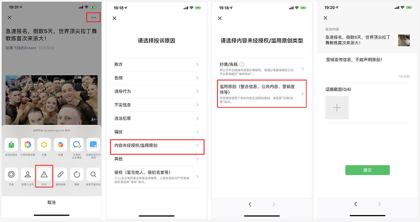 微信公众平台尊重并鼓励原创,为保护平台的绿色运营生态环境,平台持续优化有关的保护机制,为维护原创提供了相关的申诉、投诉途径。