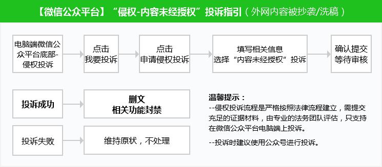 1、其他平台的文章被公众平台的帐号抄袭/洗稿了,无法在手机端发起投诉,可在电脑端的微信公众平台页面最底部的“侵权投诉”提交投诉,将会有法务工作人员进行审核处理。