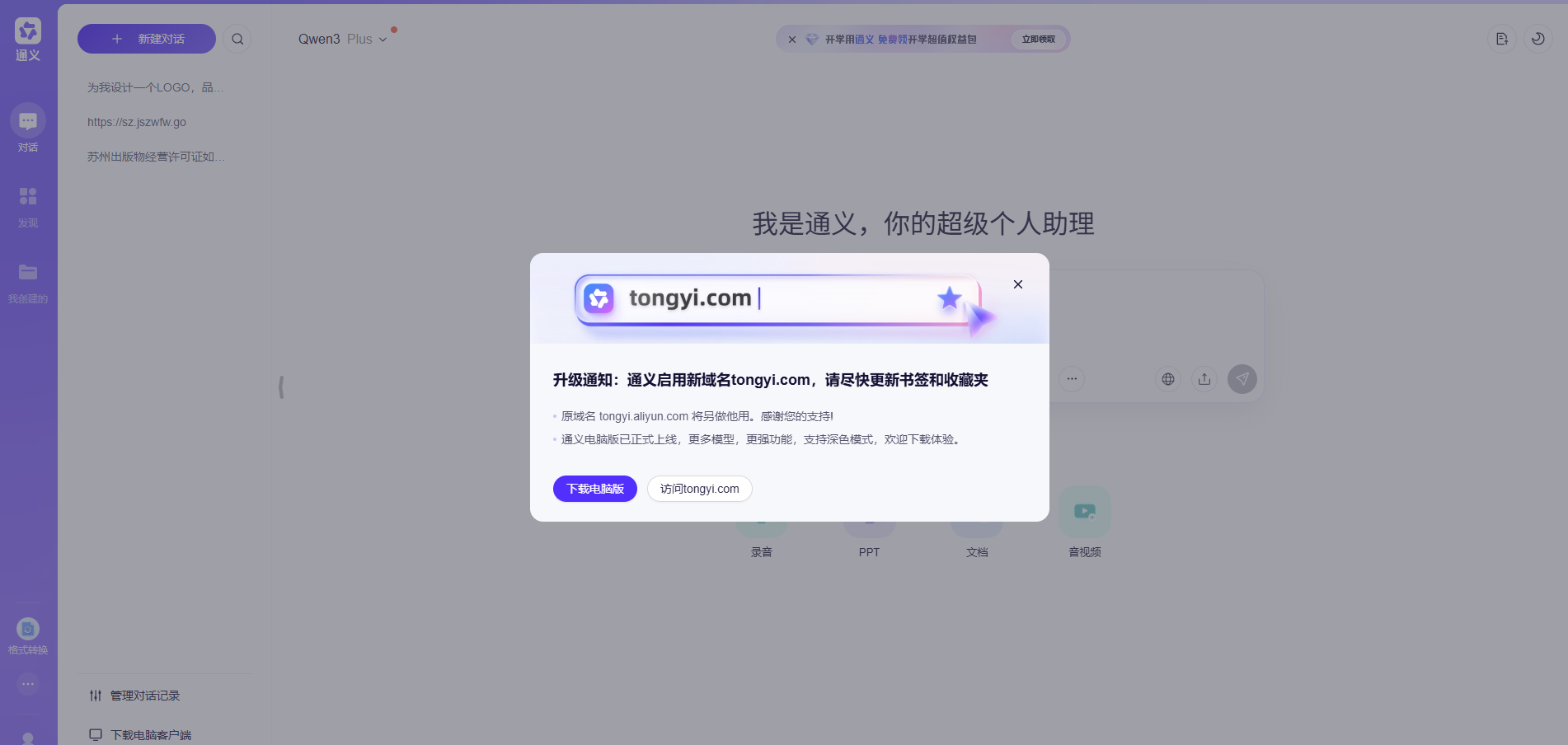 升级通知:通义启用新域名tongyi.com,请尽快更新书签和收藏夹 原域名 tongyi.aliyun.com 将另做他用。感谢您的支持! 通义电脑版已正式上线,更多模型,更强功能,支持深色模式,欢迎下载体验。